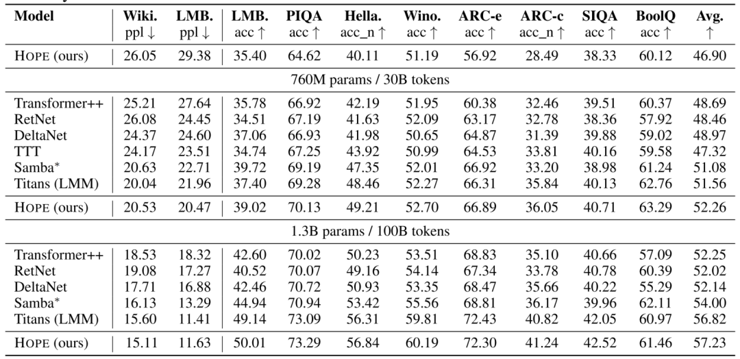 表1 HOPE 与基线模型在语言建模及常识推理任务上的性能表现(带 * 标注的为混合模型)