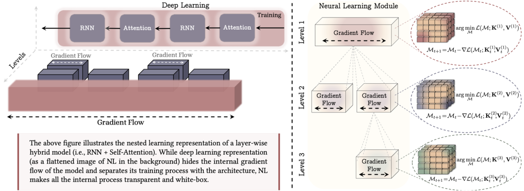 嵌套学习范式将机器学习模型及其训练过程表示为一组嵌套的优化问题。 如图1左图所示,以一种混合架构为例:从传统深度学习的视角来看,无法揭示各模块内部计算的深度层次;而 NL 则能透明地展现所有内部的梯度流动, 如图1右图所示,神经学习模块是一种能够自主学习如何压缩自身上下文流(context flow)的计算模型。以该模块的层级结构为例,其最外层对应模型的整体训练循环,通常指预训练阶段。