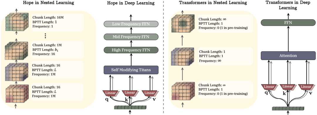图3 Hope架构与Transformer的比较(为清晰起见,已移除归一化和潜在的数据相关组件)