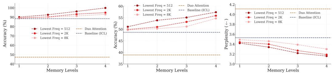 如图 7 所示。无论采用多少记忆层级,也无论最低更新频率如何设置,HOPE 均优于 ICL 基线和 DuoAttention 方法。此外,通过对比 HOPE 的不同变体,结果表明:更多的记忆层级有助于提升模型的上下文学习能力,并增强其长期记忆能力,从而改善对长上下文的理解;最低更新频率越高,模型性能反而越低。