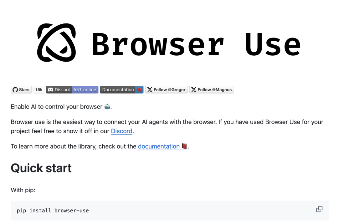 browser-use 是一款开源 Agent,在 GitHub 上有 1.5w star,一条命令就可以在本地安装使用,门槛非常低。