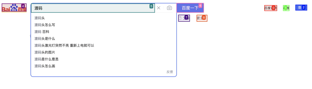 这个例子中,有两个行动,第一步,在页面元素标号12的地方(搜索框)输入‘渡码’;第二步,在页面元素标号13的地方(搜索按钮)点击,完成搜索。
