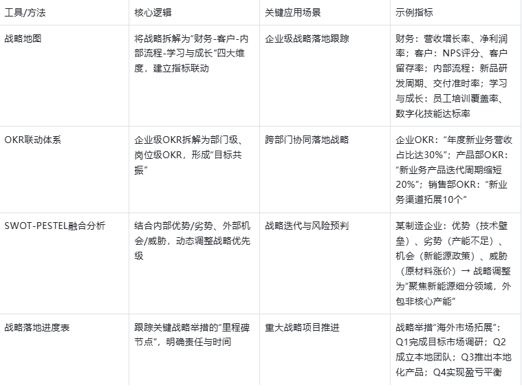 战略是经营的“指南针”,战略对齐层的核心是验证“业务动作是否与战略目标一致”,避免“南辕北辙”。核心工具与指标如下: