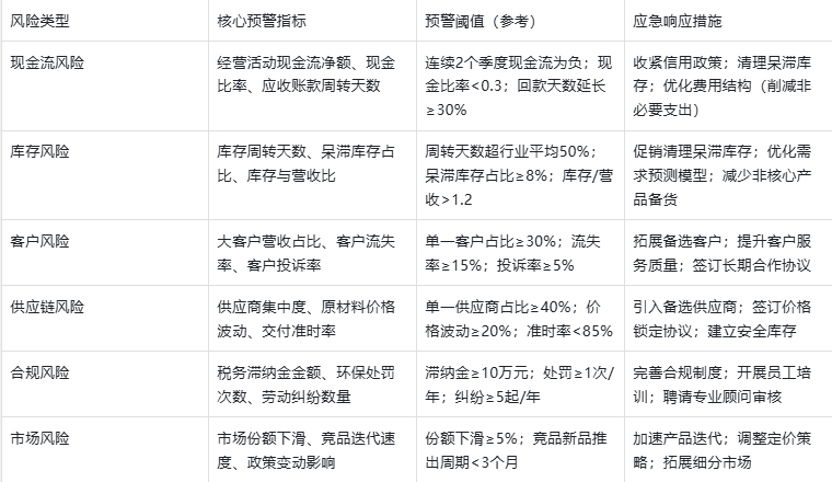 经营分析不能只看“亮点”,更要防“暗点”。风险预警层需建立“风险识别-指标监测-阈值设定-应急响应”的全流程机制,覆盖核心风险领域: