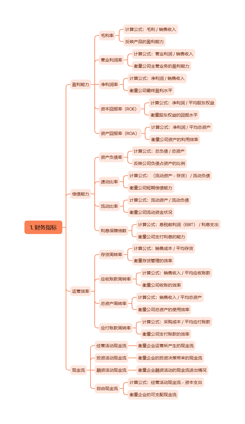 短期偿债:流动比率(流动资产/流动负债≥2)、速动比率(速动资产/流动负债≥1)、现金比率(现金及等价物/流动负债≥0.5);