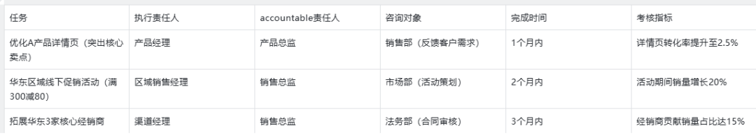 后续跟进:建立“行动追踪表”,每周跟进进度,每月复盘效果;若未达预期,及时调整方案(如促销活动效果不佳,可调整优惠力度或活动形式)。