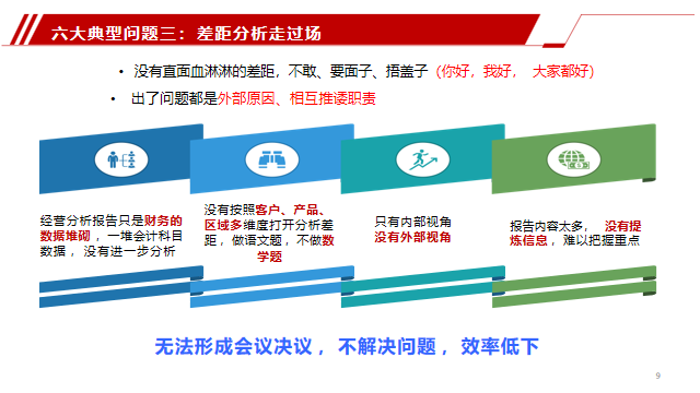 表现:分析报告数据详实、图表精美,但缺乏“责任主体、时间节点、考核指标”,导致“报告看完就忘,问题反复出现”;