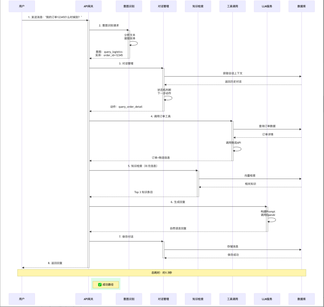 ━━━━━━━━━━━━━━━━━━━━━━━━━━━━━━━5大核心模块详解━━━━━━━━━━━━━━━━━━━━━━━━━━━━━━━模块1:意图识别(Intent Recognition)功能:理解用户真实意图技术:BERT分类 + 规则匹配输入:"我的订单什么时候到?"输出:{intent: "查询物流", confidence: 0.95}模块2:对话管理(Dialog Management)功能:管理多轮对话状态技术:状态机 + 上下文记忆示例: 轮1:"我想退货" → 状态:收集订单号 轮2:"订单号12345" → 状态:确认退货原因 轮3:"质量问题" → 状态:发起退货模块3:知识检索(Knowledge Retrieval)功能:从知识库检索相关信息技术:向量检索 + BM25混合流程: 用户问题 → 向量化 → 检索Top 5 → 重排序 → 返回最佳答案模块4:工具调用(Tool Calling)功能:调用外部系统完成任务技术:Function Calling + API集成示例: 查询订单 → 调用订单API → 返回订单详情 查询物流 → 调用物流API → 返回物流信息模块5:响应生成(Response Generation)功能:生成自然语言回复技术:LLM + 模板 + 规则策略: 简单问题 → 模板回复(快速) 复杂问题 → LLM生成(准确) 混合场景 → 模板+LLM(平衡)━━━━━━━━━━━━━━━━━━━━━━━━━━━━━━━