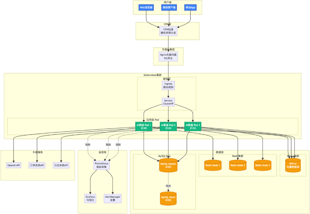 # k8s/deployment.yamlapiVersion: apps/v1kind: Deploymentmetadata: name: ai-customer-servicespec: replicas: 3 selector: matchLabels: app: ai-customer-service template: metadata: labels: app: ai-customer-service spec: containers: - name: ai-customer-service image: your-registry/ai-customer-service:latest ports: - containerPort: 8000 env: - name: OPENAI_API_KEY valueFrom: secretKeyRef: name: ai-secrets key: openai-api-key resources: requests: memory: "512Mi" cpu: "500m" limits: memory: "1Gi" cpu: "1000m"---apiVersion: v1kind: Servicemetadata: name: ai-customer-servicespec: selector: app: ai-customer-service ports: - port: 80 targetPort: 8000 type: LoadBalancer