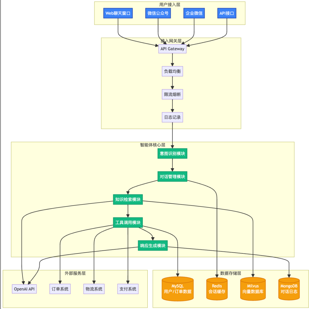 ━━━━━━━━━━━━━━━━━━━━━━━━━━━━━━━企业级AI客服系统架构(分层设计)━━━━━━━━━━━━━━━━━━━━━━━━━━━━━━━┌─────────────────────────────────────────┐│ 用户接入层(Multi-Channel) ││ • 网页聊天窗口(Web Widget) ││ • 微信公众号(WeChat) ││ • 企业微信(WeCom) ││ • API接口(REST API) │└─────────────────────────────────────────┘ ↓┌─────────────────────────────────────────┐│ 接入网关层(API Gateway) ││ • 请求路由 ││ • 负载均衡 ││ • 限流熔断 ││ • 日志记录 │└─────────────────────────────────────────┘ ↓┌─────────────────────────────────────────┐│ 智能体核心层(Agent Core) ││ ┌───────────────────────────────────┐ ││ │ 1. 意图识别模块(Intent) │ ││ │ • NLU理解 │ ││ │ • 实体提取 │ ││ │ • 情感分析 │ ││ └───────────────────────────────────┘ ││ ┌───────────────────────────────────┐ ││ │ 2. 对话管理模块(Dialog) │ ││ │ • 上下文管理 │ ││ │ • 多轮对话 │ ││ │ • 状态机控制 │ ││ └───────────────────────────────────┘ ││ ┌───────────────────────────────────┐ ││ │ 3. 知识检索模块(Knowledge) │ ││ │ • 向量数据库 │ ││ │ • 混合检索 │ ││ │ • 相关性排序 │ ││ └───────────────────────────────────┘ ││ ┌───────────────────────────────────┐ ││ │ 4. 工具调用模块(Tools) │ ││ │ • 订单查询 │ ││ │ • 物流查询 │ ││ │ • 退换货处理 │ ││ └───────────────────────────────────┘ ││ ┌───────────────────────────────────┐ ││ │ 5. 响应生成模块(Generation) │ ││ │ • LLM调用 │ ││ │ • 模板填充 │ ││ │ • 多模型路由 │ ││ └───────────────────────────────────┘ │└─────────────────────────────────────────┘ ↓┌─────────────────────────────────────────┐│ 数据存储层(Data Layer) ││ • MySQL:用户数据、订单数据 ││ • Redis:会话缓存、热点数据 ││ • Milvus:向量数据库(知识库) ││ • MongoDB:对话日志、用户画像 │└─────────────────────────────────────────┘ ↓┌─────────────────────────────────────────┐│ 外部服务层(External Services) ││ • OpenAI API / 文心一言 ││ • 订单系统 API ││ • 物流系统 API ││ • 支付系统 API │└─────────────────────────────────────────┘技术栈:• 后端:Python + FastAPI• 前端:React + WebSocket• 数据库:MySQL + Redis + Milvus• 部署:Docker + Kubernetes• 监控:Prometheus + Grafana━━━━━━━━━━━━━━━━━━━━━━━━━━━━━━━
