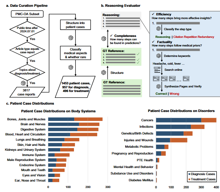 下图是本文的数据处理流程:从 PMC-OA 中筛选出 2024 年 7 月后发表、类型为 case report 且主题为诊断/治疗的文章,经过 GPT-4o 结构化为患者病例,并进一步利用 GPT-4o 对每例病例进行“身体系统”“疾病类别”分类及罕见病标注。图 2b 详细展开 Reasoning Evaluator:先把推理文本拆分成步骤,再把每步分类为“真正的推理、引用原文、重复、冗余”,仅保留有效推理步;随后抽取关键词(如“发热、头痛、血培养”等),调用网络搜索聚合多页信息,判断每一步是“正确”或“错误”;如果有参考推理,则逐条检查这些参考步骤是否在模型推理中出现,据此计算效率、事实性、完整性。