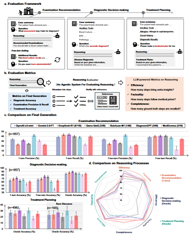 - 模型与人类基线:评估 7 个推理 LLM:OpenAI-o3-mini、Gemini-2.0-Flash-Thinking、DeepSeek-R1、Qwen-QwQ、Baichuan-M1、DiagnosisGPT、MedGemma,并邀请 6 名有约 5 年临床经验的医生,在“给足所有检查信息”的 oracle 条件下完成诊断和治疗任务,作为人类参照。