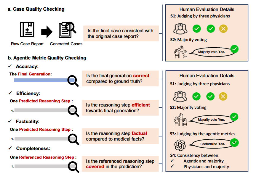 下图还展示研究过程中病例质量审核流程:随机抽取 100 例由 GPT-4o 重构的病例,三位医生独立对照原始 case report,判断“重构病例是否与原文一致”,再用多数学者意见作为最终结论,用来验证结构化病例的可靠性。图 3b 展示对 agentic 指标本身的验证:随机抽取部分病例的最终预测及推理步骤,让医生逐条标注诊断/治疗是否正确、某一步是否“有效”“事实正确”“覆盖了给定的参考推理”,再与 Reasoning Evaluator 的判定做一致性比较,从而证明这个自动评分系统与医生多数意见的吻合度(一般在 ~95% 左右),可以作为规模化打分工具。