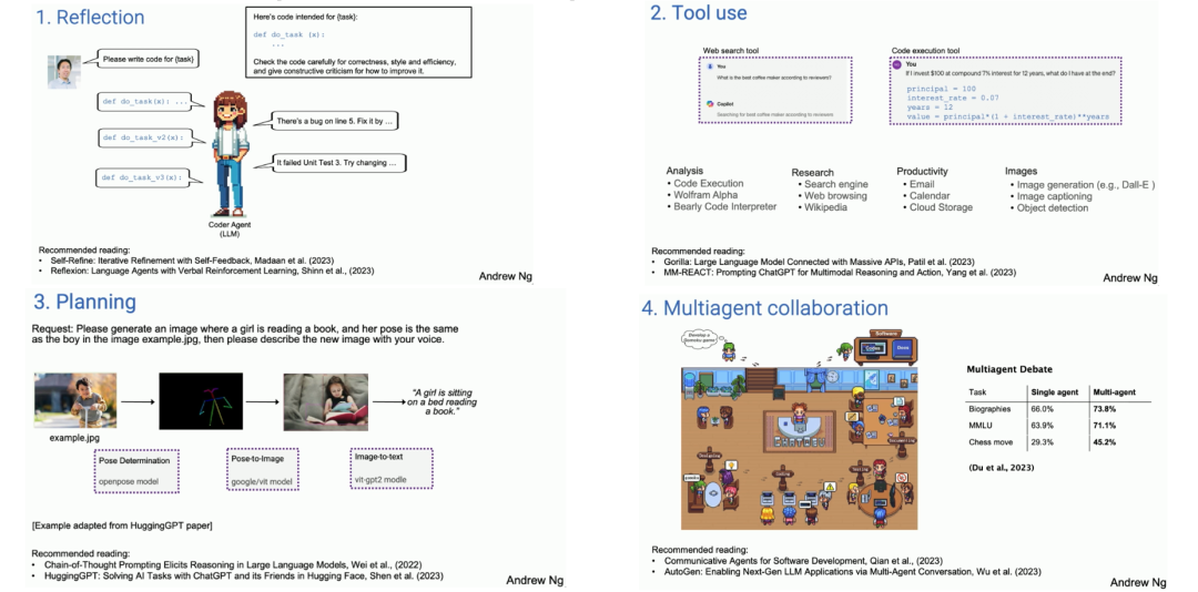 吴恩达教授在红杉资本的人工智能峰会(AI Ascent)上谈到了自己对于AI Agent认知框架设计模式的四种分类,包括反思、工具使用、规划、多智能体协作。