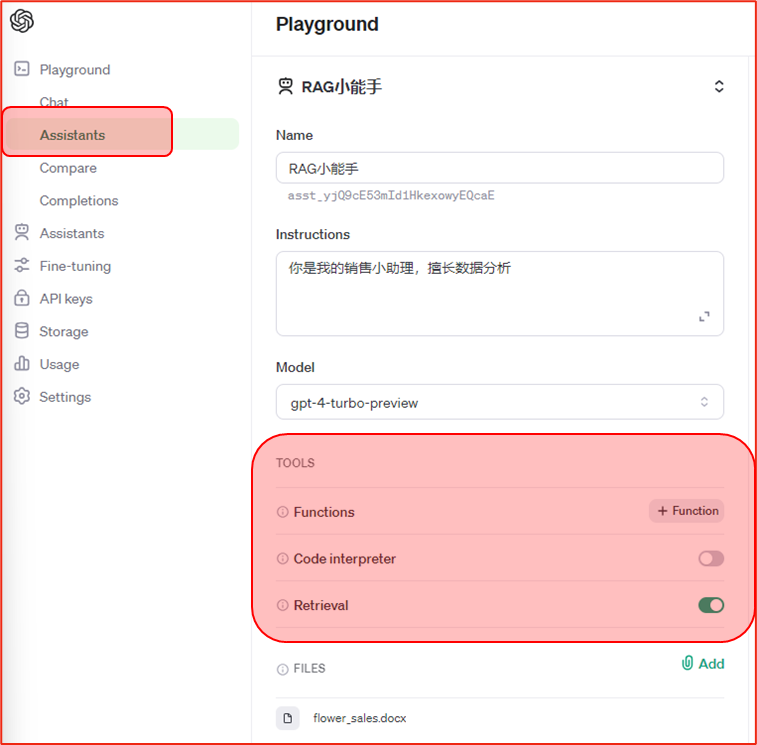 OpenAI Assistant中的支持的工具有代码解释器(数据分析)、函数调用、文件检索工具等等。对于需要与现有系统集成或执行具体技术任务的应用,如自动化脚本或数据分析,此方法非常合适。