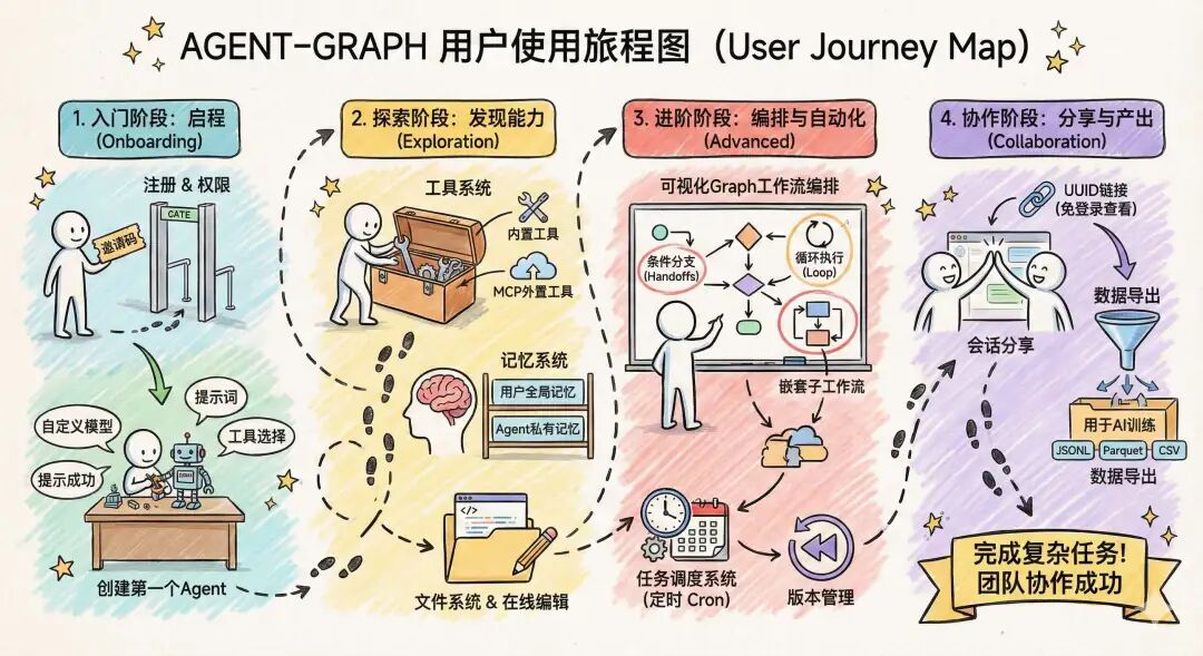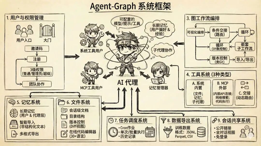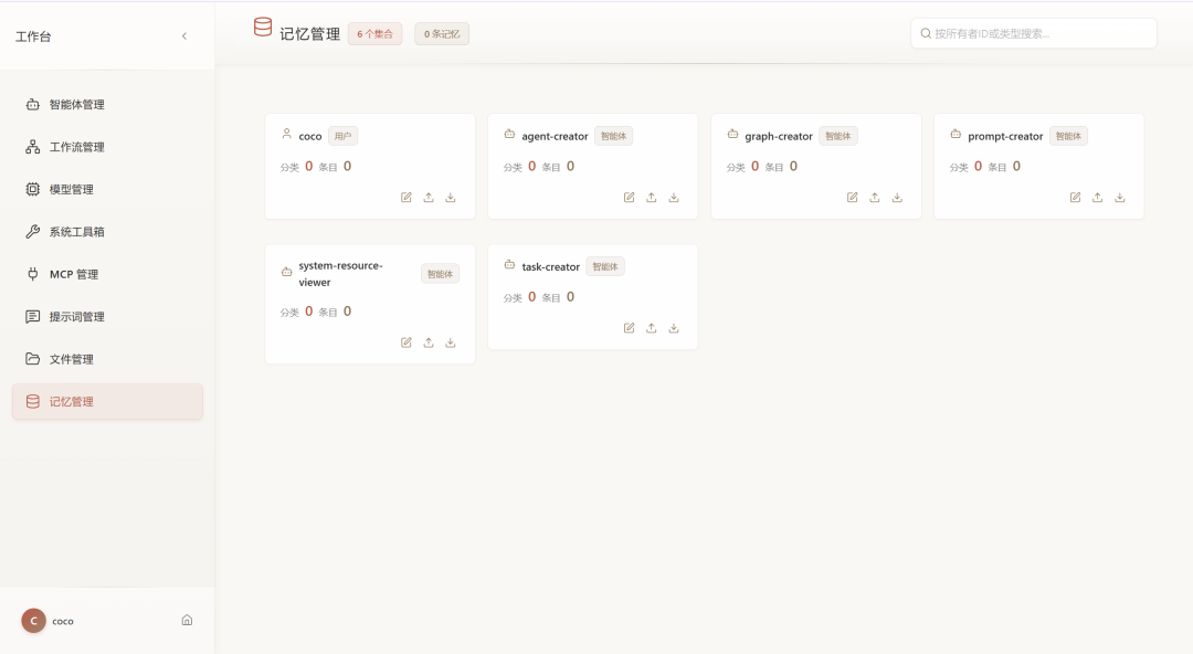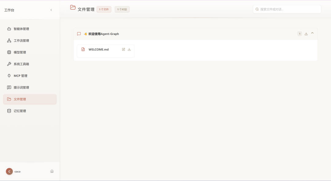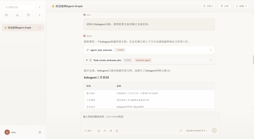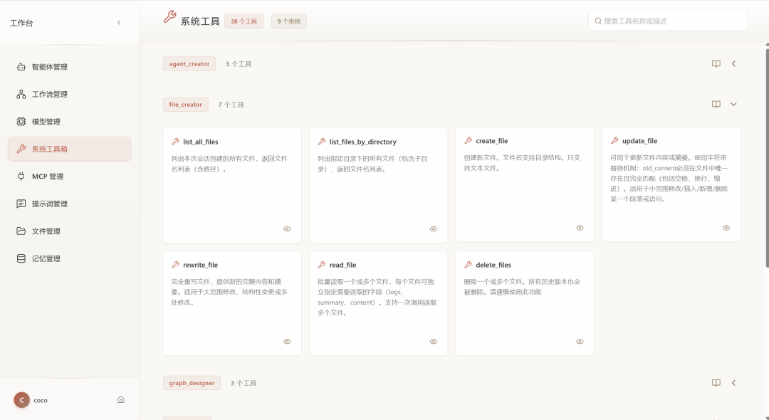 | 内置工具集 | 提供资源创建(Agent Creator、Graph Designer、MCP Builder、Prompt Generator、Task Manager)、协作(Sub-agent、File Tool)和查询(Memory Tool、System Operations)等系统工具 |