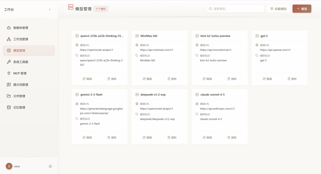 配置和管理多个 LLM 模型,设置 API Key 和模型参数。