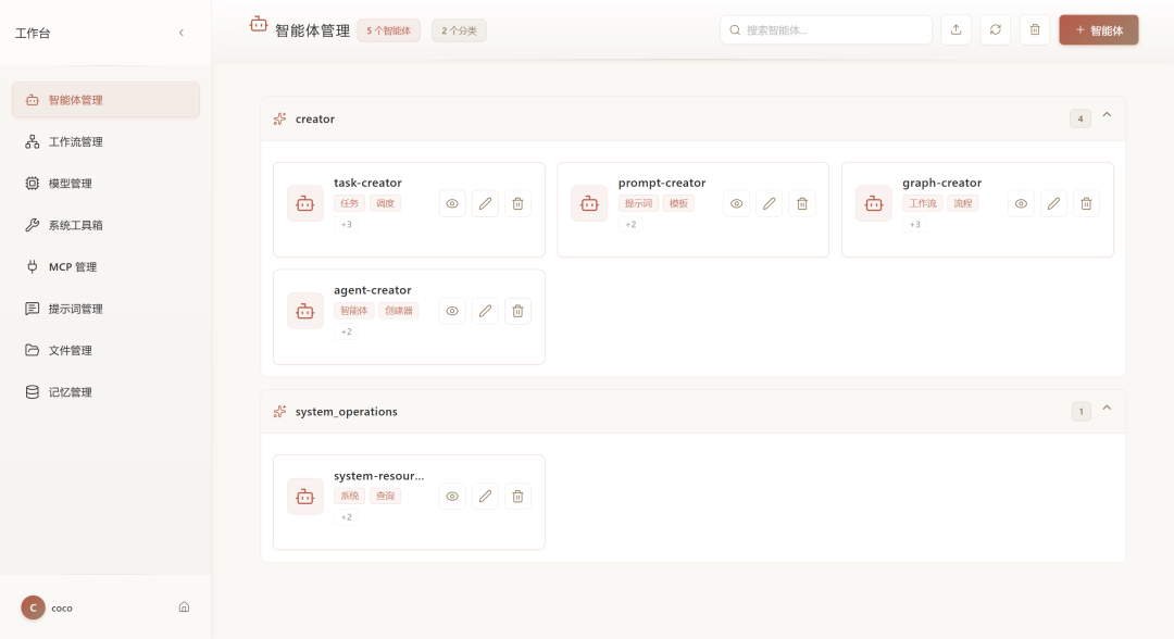 创建、配置和管理智能体,设置系统提示词、工具和模型参数。