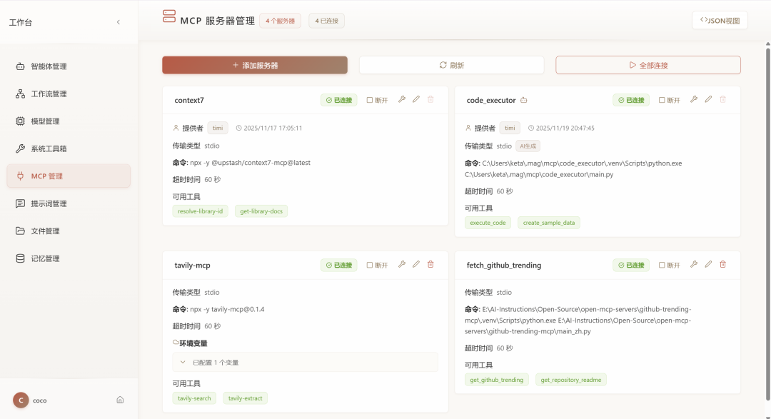 管理 MCP 服务器连接,配置外部工具和数据源集成。