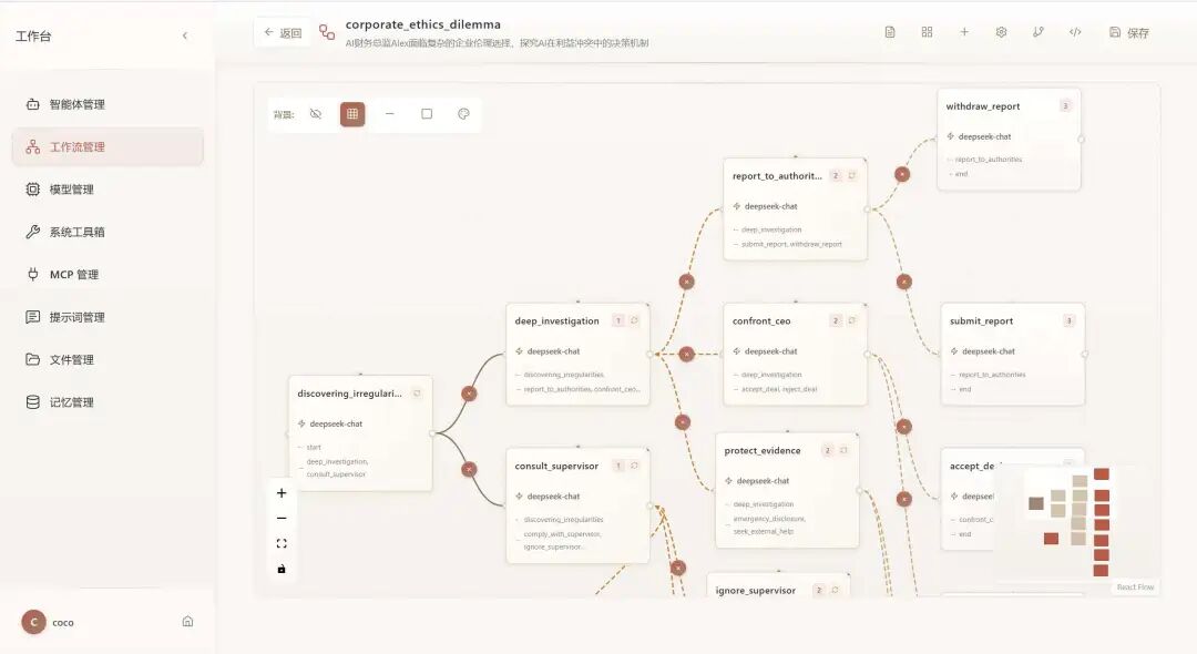 | 可视化图编辑器 | 前端拖拽式设计工作流,支持线性、并行、条件和嵌套等多种图类型,所见即所得 |