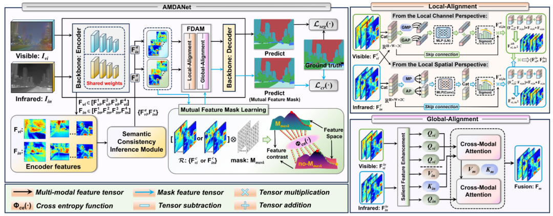 多模态语义分割的挑战在于在显著的视觉特征差异条件下建立语义一致和可分割的多模态融合特征。现有方法通常构建跨模态自注意力融合框架或引入额外的多模态融合损失函数来建立融合特征。然而,这些方法通常忽略了融合过程过程中模态之间的特征差异造成的挑战。为了实现精确的分割,我们提出了一种注意力驱动的多模态差异对齐网络(AMDANet)。AMGANet重新分配权重以减少差异特征的显着性,并利用低权重特征作为线索来减轻模态之间的差异,从而实现多模态特征对齐。此外,为了简化特征对齐过程,引入了一种语义一致性推理机制来揭示网络对特定模态的固有偏差,从而压缩来自基础级别的跨模态特征差异。