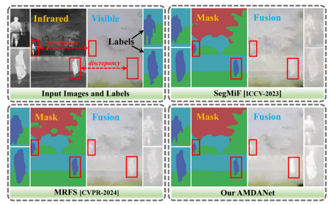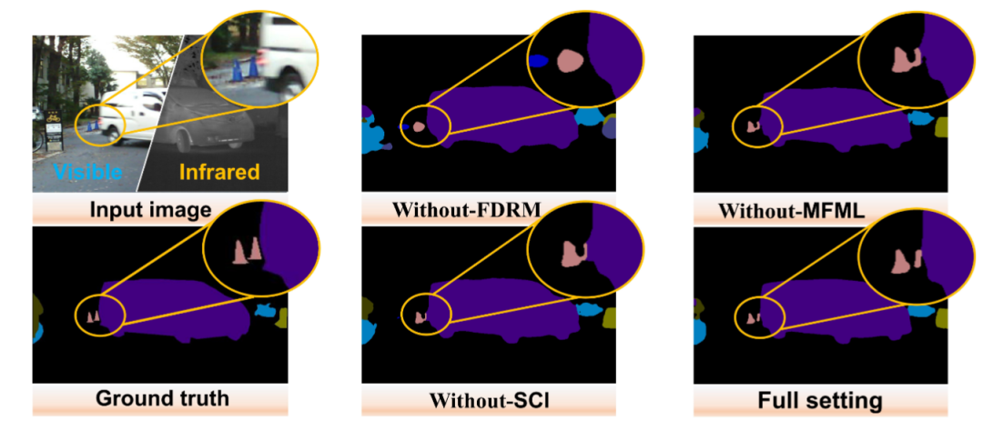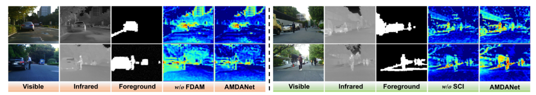 模块效果:在MFNet数据集上的消融研究:与AMDANet 相比,所有变体都表现出不同程度的性能下降,证明了每个模块设计的有效性。没有 FDAM 的变体表现出最显着的性能下降,这表明没有模态间歧义抑制阻碍了形成促进语义分割的一致特征。