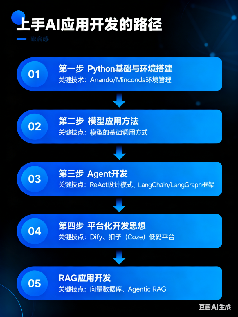 Agent开发是AI应用的核心部分。推荐从ReAct设计模式入手,学会使用OpenAI SDK搭建简单Agent实例。随着技能不断提升,可以通过LangChain、LangGraph等主流框架提升效率。之后,需要熟悉ReAct模式之外的计划模式、反思模式等,并掌握MCP、A2A协议及SDK调用方法。最终,拓展到多智能体系统的开发,以应对更复杂的业务场景。