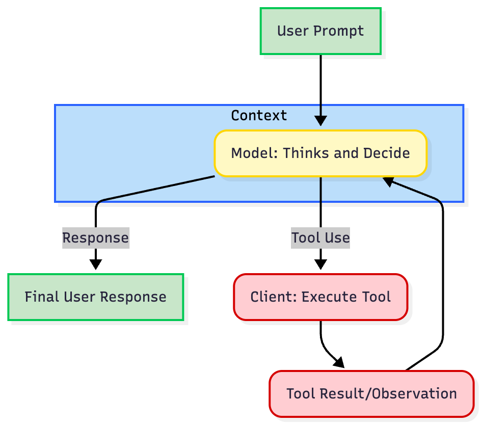 响应与迭代:将工具执行结果反馈给模型,模型利用新信息决定下一步操作,要么调用另一个工具,要么生成最终响应。