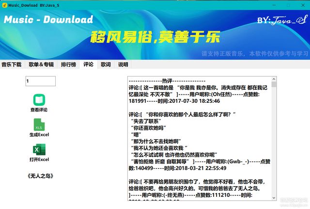 - 支持查看网易云每一首音乐的评论,支持将评论写入Excel