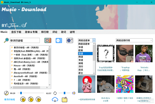 - 支持通过网易云歌单、专辑ID,获取当中的音乐;支持一键下载当中的所有音乐