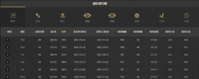 #{'name': ['TES', 'JDG', 'V5', 'IG', 'SN'], 'outcount': ['40', '43', '49', '44', '52'], 'winRate': ['75%', '72%', '61%', '59%', '59%']}
