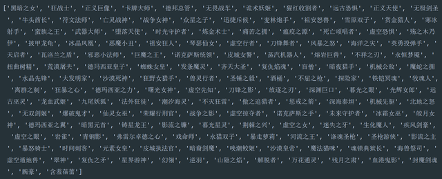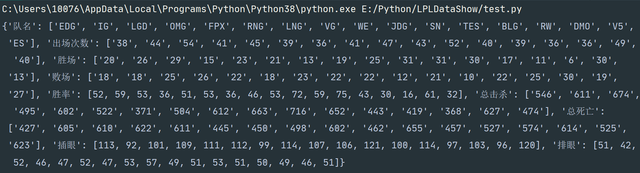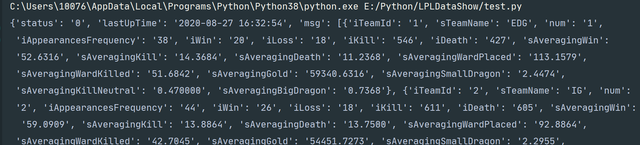 可以看出所有的战队信息已经获取成功,可是输出的内容是一个str(字符串)对象,我们需要使用json.loads()函数将str对象转换为dict(字典)对象。再使用字典和列表的方法就可以将想要的数据提取出来,并且存放到另外一个字典里面