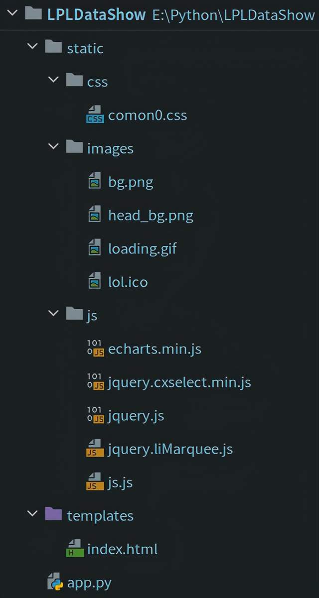 我们需要将写好的HTML文件放在【templates】目录下,CSS、JS和所用到的图片放在【static】目录下,如下图所示