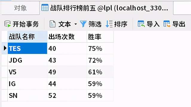 #sql语句,从【战队排行榜前五】这张表中,选择战队名称,出场次数,胜率
