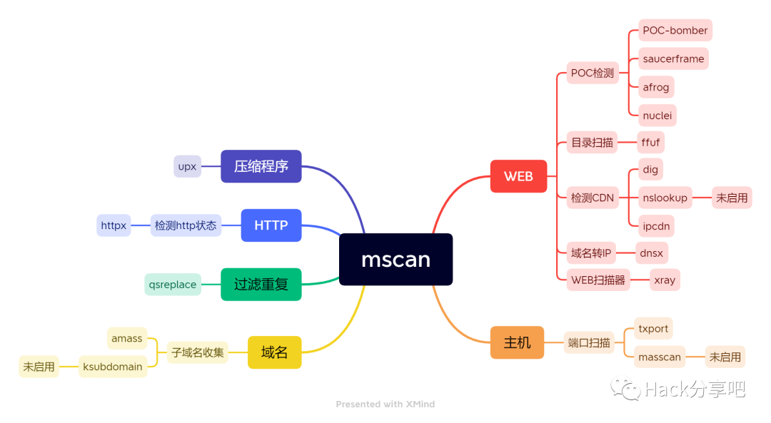 支持子域名收集、POC批量验证、目录扫描、检测CDN、域名转IP、主机扫描、过滤重复、检测HTTP状态、压缩程序、XRAY扫描,架构图如下。