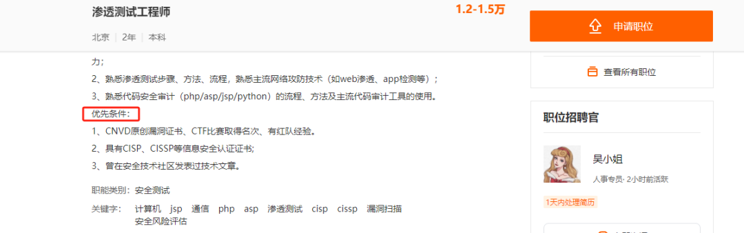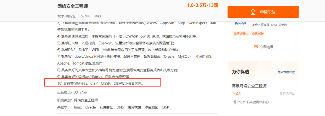 这是目前网安领域招聘量最大的岗位,技术重心偏向于防守,加固系统安全和布置蜜罐的活都是他们来干,如果你有CISP或NISP证书的话,找工作就更轻松了。