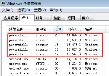 询问朋友是否下载了什么或在电脑上搭建了些什么,他回答说不知道,让我自己检查。当时我真想通过远程桌面(3389端口)过去给他一个响亮的耳光。但最终还是决定亲自处理。打开任务管理器,立刻注意到几个可疑的powershell进程。