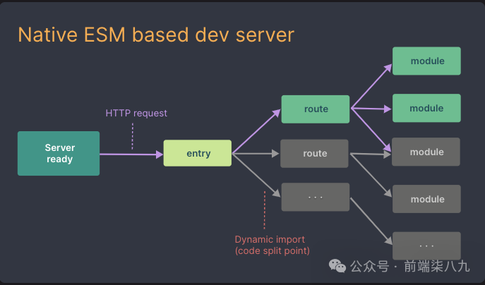 在开发环境,Vite以原生ESM方式提供源码,让浏览器接管了打包程序的部分工作:Vite 只需要在浏览器请求源码时进行转换并按需提供源码。根据情景动态导入代码,即只在当前屏幕上实际使用时才会被处理。