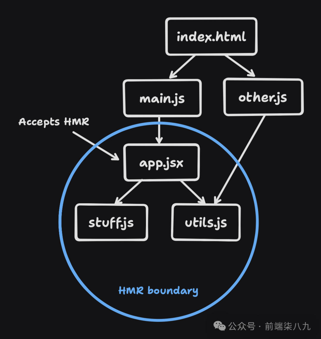 已接受模块创建了一个HMR 边界。一个HMR 边界包含模块本身以及所有递归导入的模块。接受模块通常也是HMR 边界的根,因为边界通常是**「图形结构」**。❞