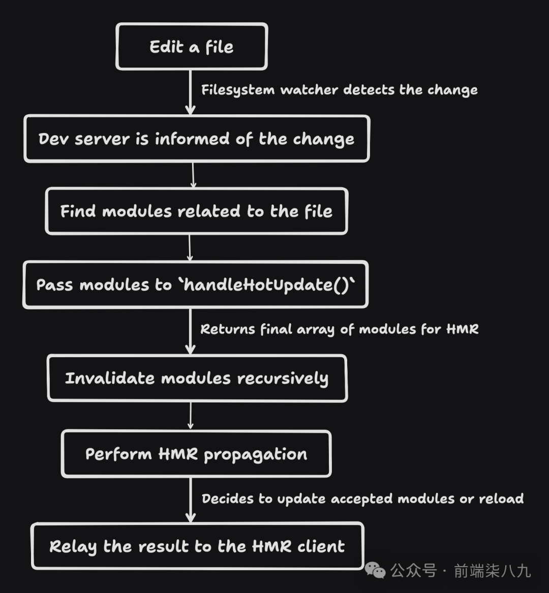 既然,HMR API赋予了我们替换和删除模块的能力,光有能力是不行的,我们需要了解它们何时才会起作用。其实,HMR 通常发生在**「编辑文件之后」**,但是之后又发生了啥,我们不得而知,这就是我们这节需要了解的内容。