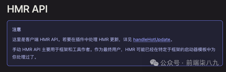 虽然不是 HMR 必需的,但 HMR 客户端还可以在运行时发出事件,当收到特定信息时。import.meta.hot.on 和 import.meta.hot.off 可以用于监听和取消监听这些事件。