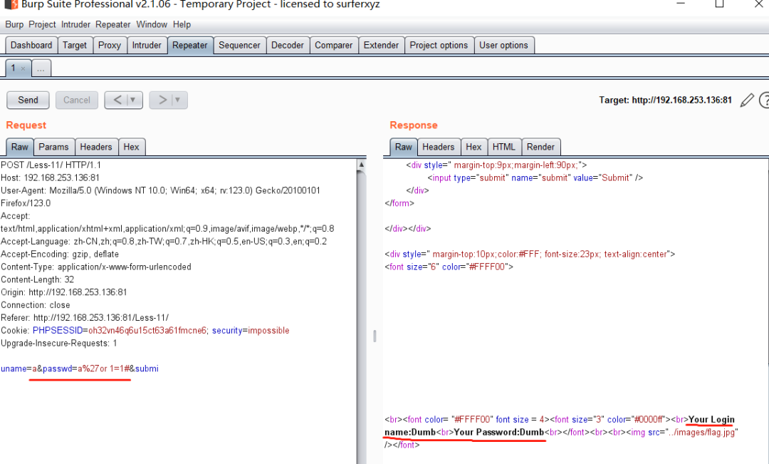 通过burpsuite截获数据(用任意抓包工具都可),并发送到Repeater,修改数据并进行重发: