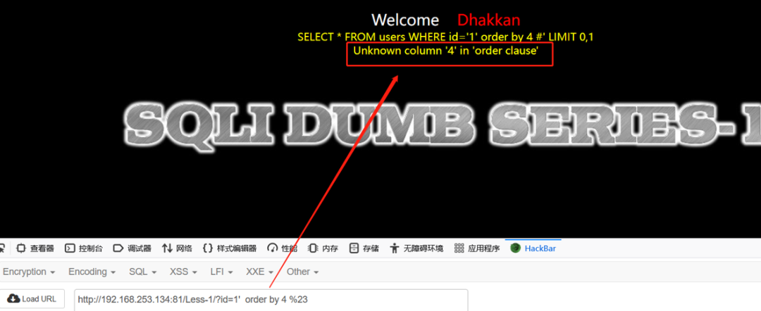 输入 id=1’ order by 4 #,报错!不存在第4列,说明当前查询的用户表数据一共只有3列!