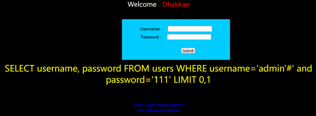 直接在username中填写admin’or 1=1#,password随便写,此时登录成功,Username存在SQL注入漏洞。Password同理。